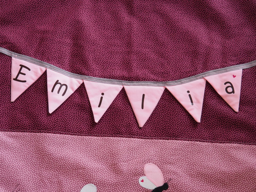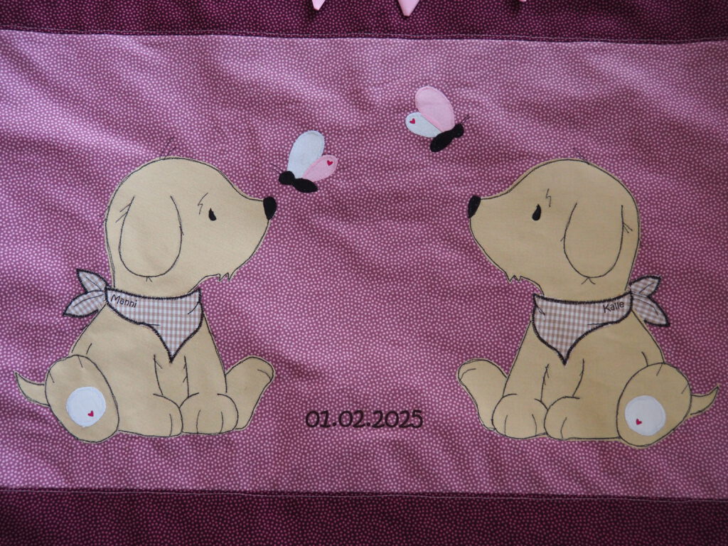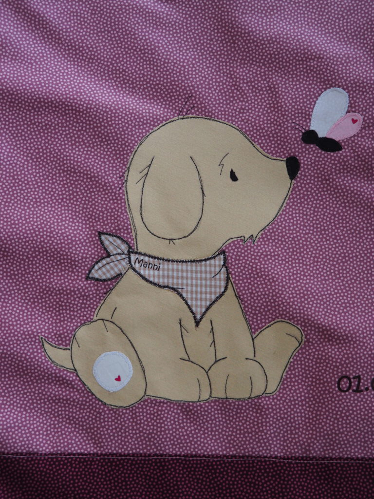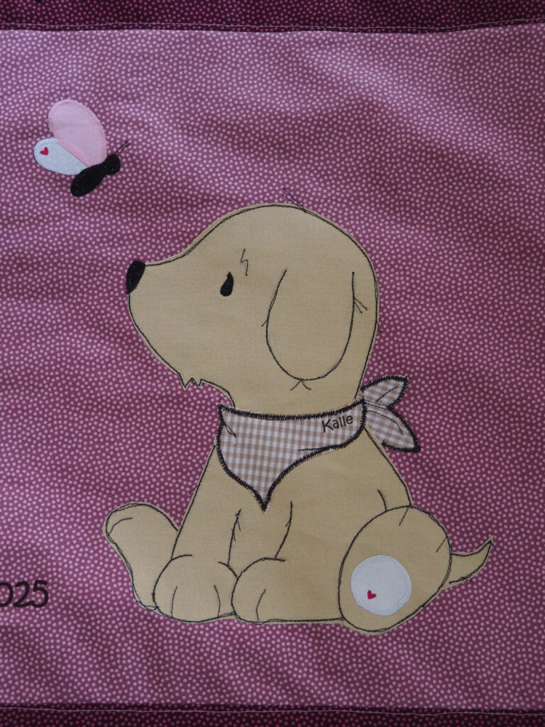 Schon Anfang des Jahres ist eine Krabbeldecke mit einem neuen Motiv entstanden. Da es in der Familie auch zwei Hunde gibt, sollten diese auch einen Platz auf der Decke bekommen. Das Motiv habe ich bei https://stickwolke-de.3dcartstores.com/ bekommen und den passenden Schnitt der Rassel bei https://monstabella.de/.
